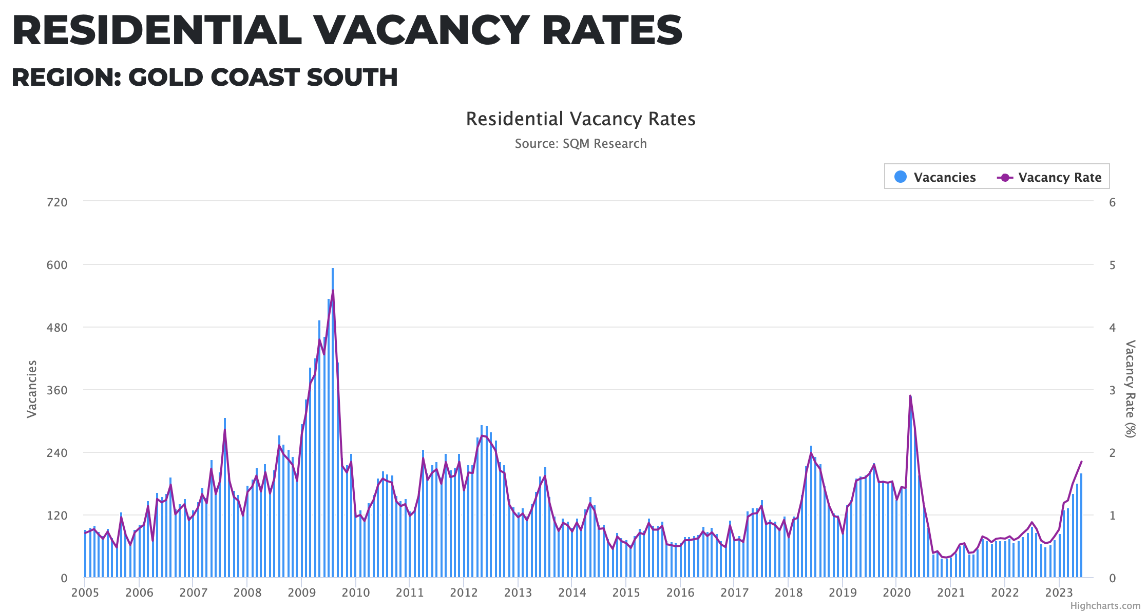 The data agrees with the agents. The Southern Gold Coast has gone from a 0.5% vacancy rate in October, 2022 to 1.8% for the month of June, 2023.